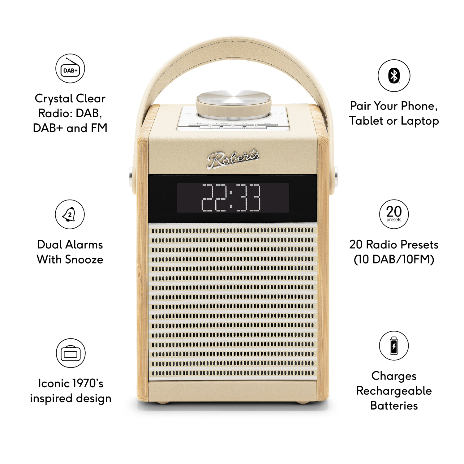 The Rambler Midi blends timeless design with modern convenience, making it a versatile addition to any home. Its iconic bamboo and brushed aluminium design offers both style and superior sound quality. With DAB+/FM wavebands and Bluetooth streaming, it brings your favourite stations and music to life. Dual alarms and a USB charging port add extra functionality, perfect for bedside or portable use.